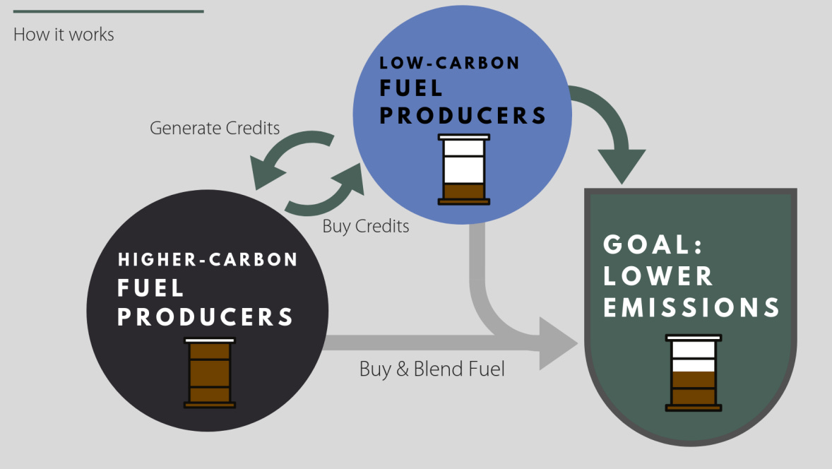 So what even is LCFS? Under the lower carbon fuel standard, entities (aka, fuel producers and importers) have to meet a level of carbon intensity for their product. Carbon intensity (CI) refers to how many CO2 emissions are released per unit of activity. In this case, CI is in grams of CO2 per megajoule of energy.
