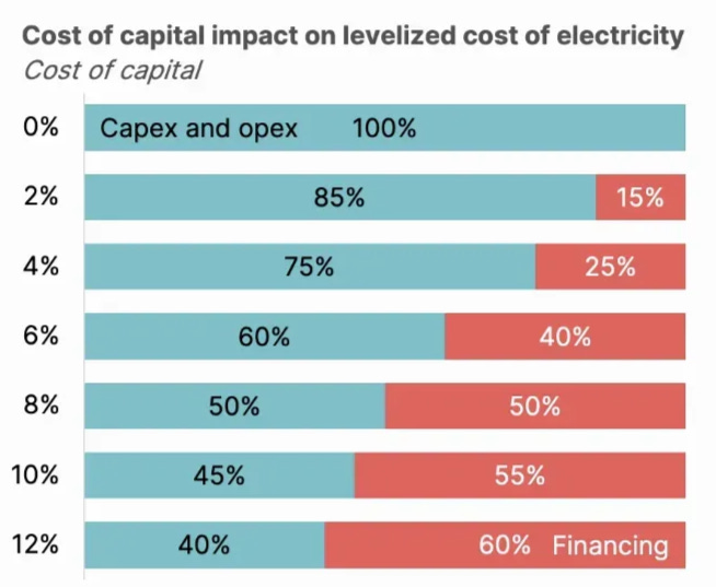 breaks this down well in his meaty annual Decarbonization Deck. At an 8% cost of capital, where an investor expects returns of 8%, financing makes up half of the Levelized Cost of Electricity (LCOE).