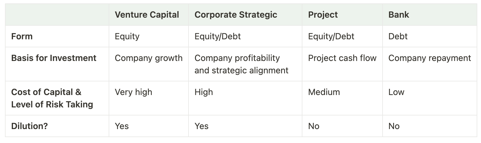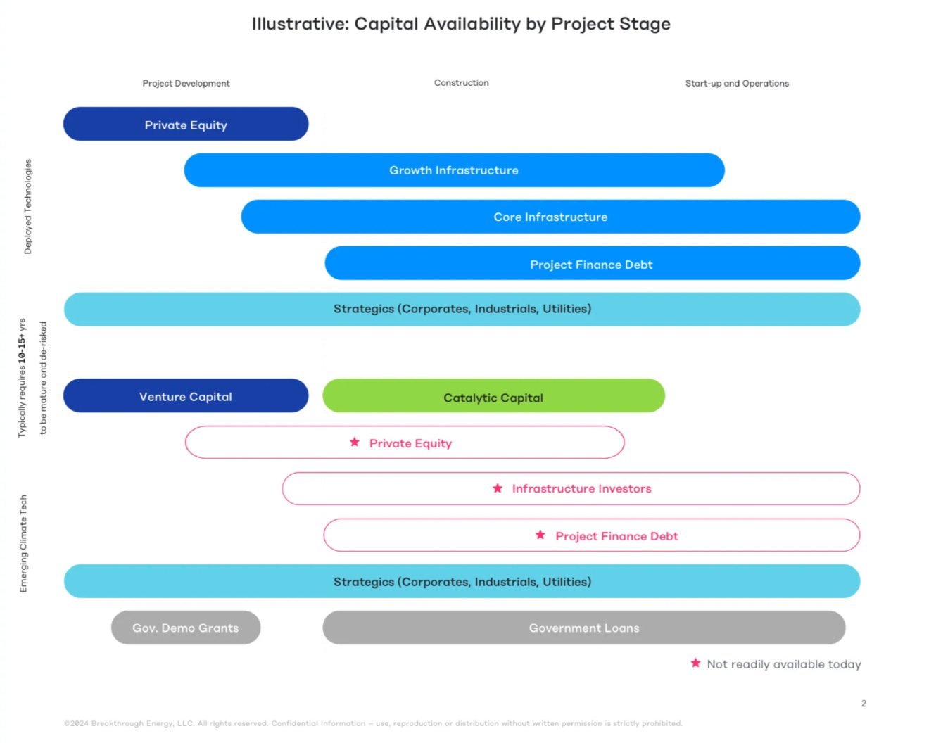 Emerging Climate Tech will require capital from Private Equity, Infrastructure Investors, and Project Finance Debt that are not readily available today, as shown in the chart below. Emerging Climate Technologies (ECTs) have limited access to funding as they are seen as riskier investments to established technologies.