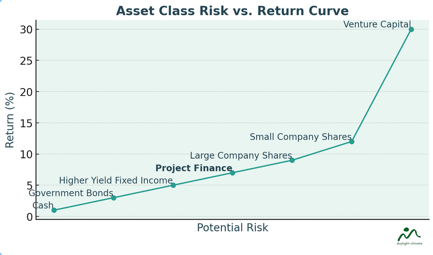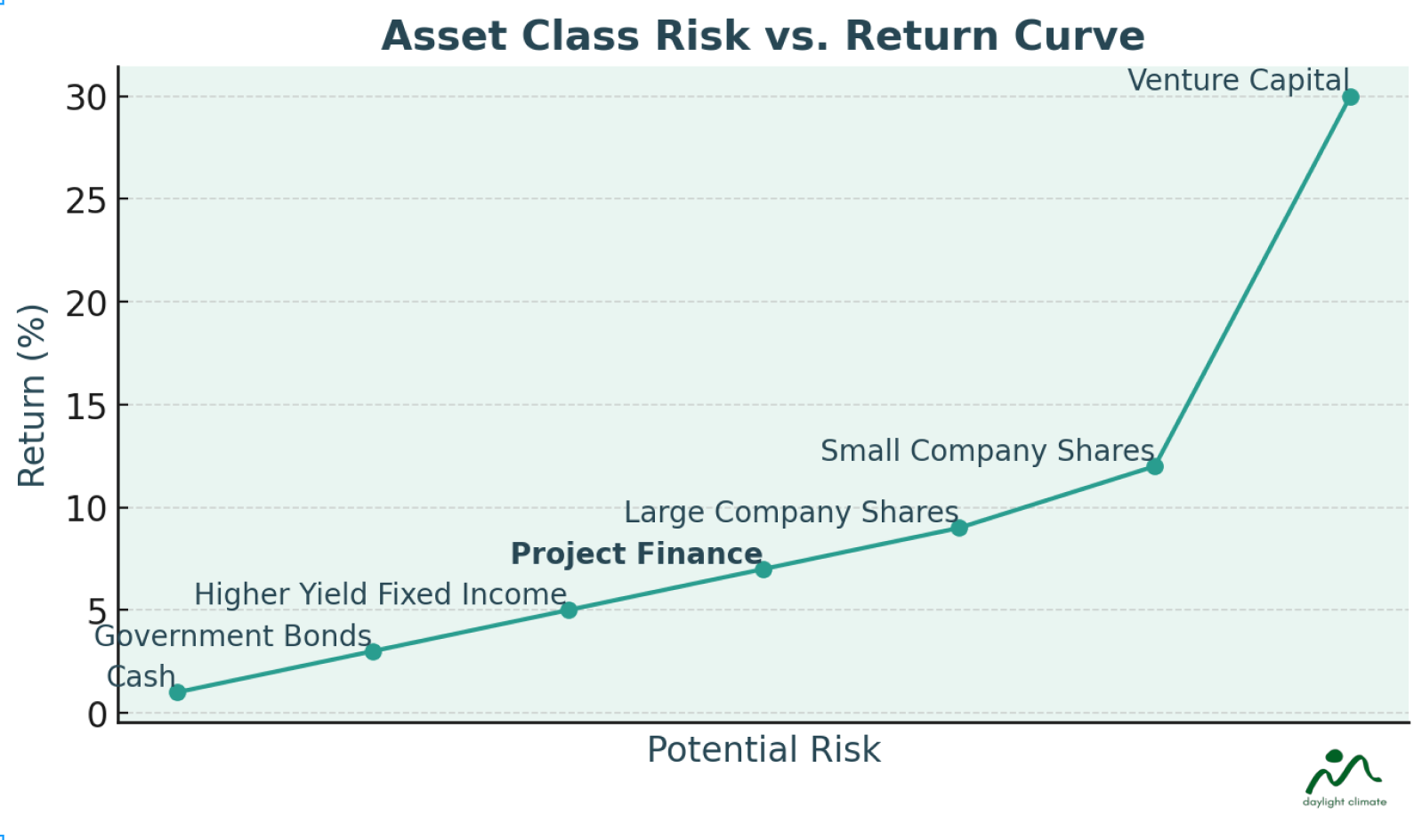 If you’re like me and need a bit of a finance 101, let’s start with asset classes. Finance asset classes are categorized by their levels of risk and return. Project finance sits much lower on the risk-turn curve than does risk-tolerant venture capital. This maps to the “required return hurdle” BEC graph above.