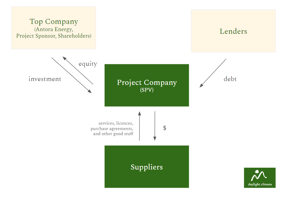 A new project company known as the “special purpose vehicle” or SPV is financially and legally independent from the “Top Company”. The project sponsor is the big energy company looking to do the project, such as a wind developer building a new wind farm or a company like Antora. The established project company has assets, liabilities, and equity on its balance sheet. By setting up a separate entity for the project, the top company’s assets are protected.